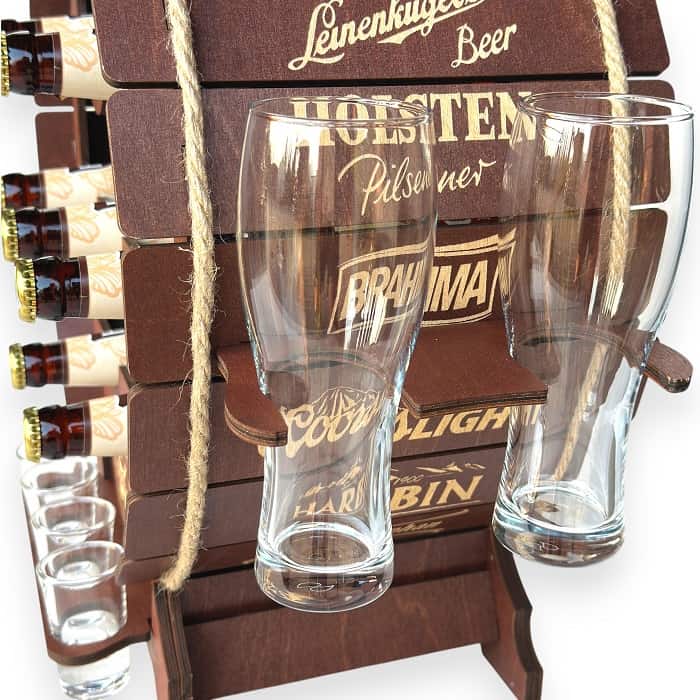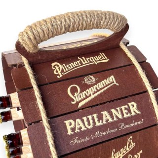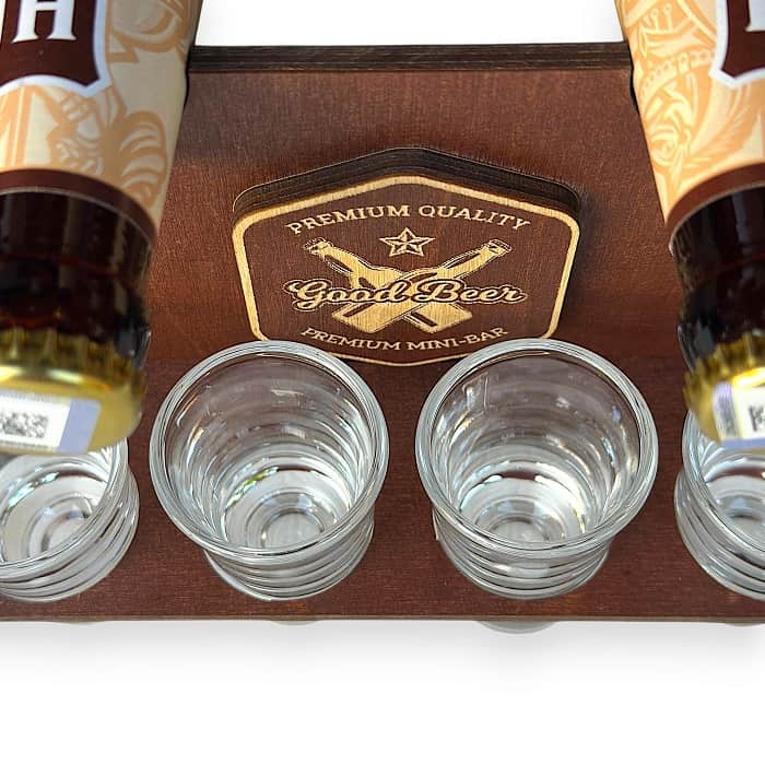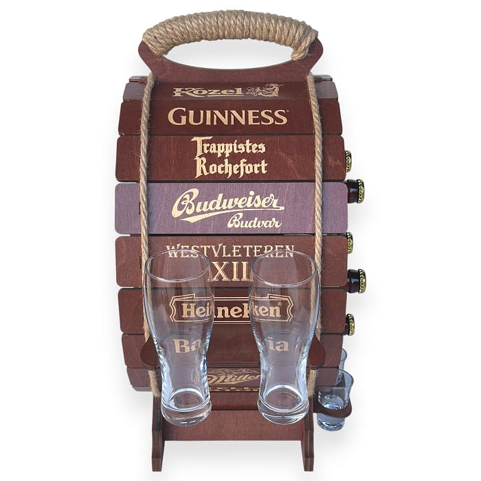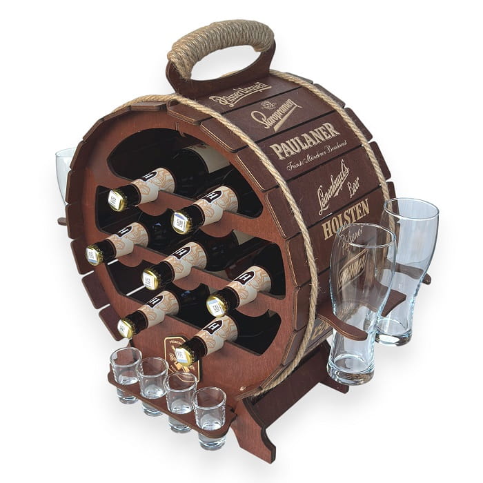 Подставка из дерева обеспечивает удобное, компактное размещение бутылок и баночек пива.