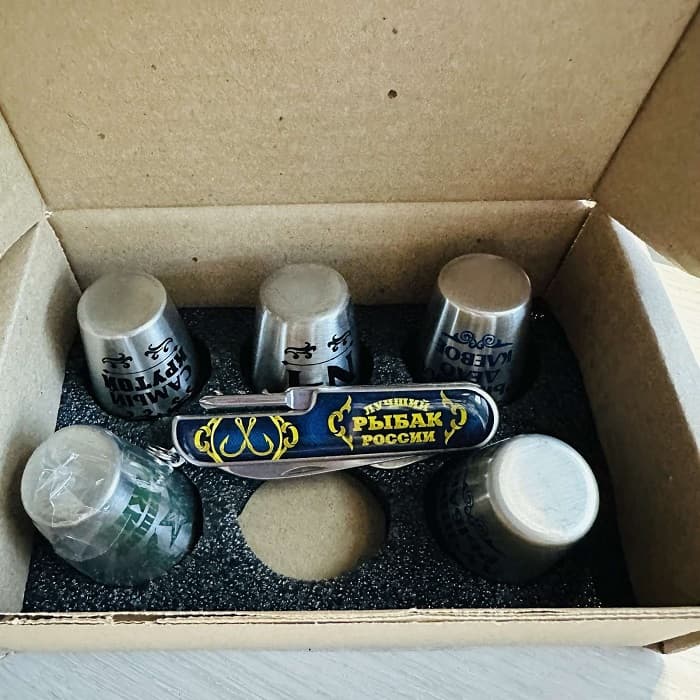 Купить Набор «Лучший рыбак»: нож-мультитул, 5 стопок в Минске можно, оформив заказ через корзину сайта или позвонив по телефонам, указанным на сайте. Также заказать Набор «Лучший рыбак»: нож-мультитул, 5 стопок можно с доставкой в любую точку Беларуси (Брест, Гродно, Гомель, Витебск, Могилев, Бобруйск, Барановичи, Новополоцк, Пинск, Борисов, Мозырь и т.д.).