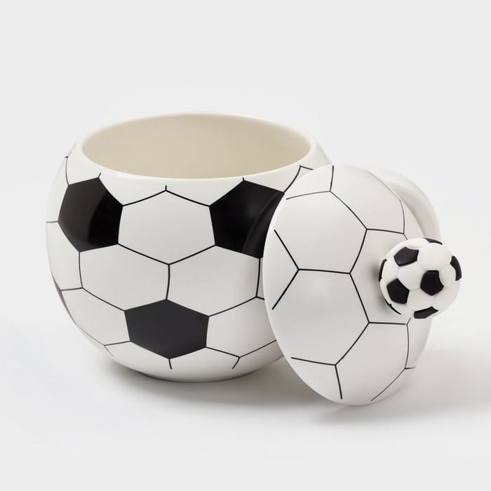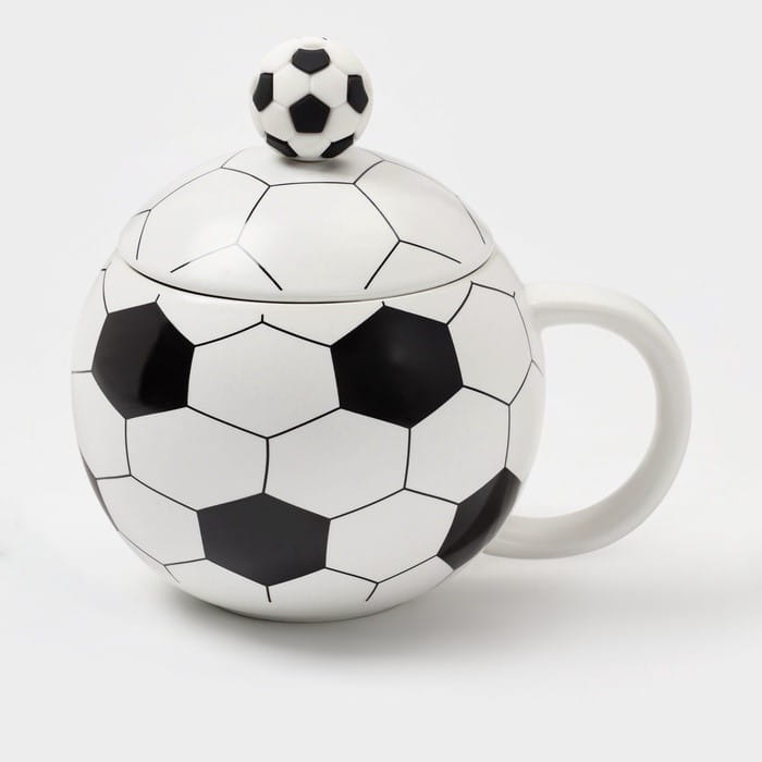 Оригинальная керамическая кружка с крышкой «Футбольный мяч» - впишется в интерьер кухни или офиса поклонника спорта. Изделие подходит в качестве подарка на праздник или приятного сюрприза для детей или коллекционеров атрибутики. Яркий декор на белой поверхности привлекает внимание и подчеркивает увлечения владельца.