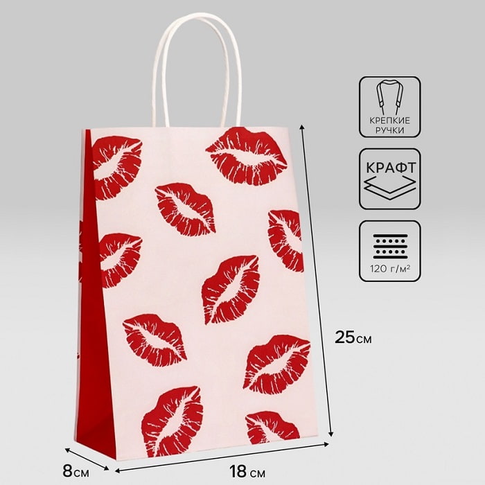 Пакет подарочный «Поцелуй» крафт 17,5 x 25 x 8 см идеально подойдет для эксклюзивной упаковки любого подарка! Интересный дизайн усилит приятное впечатление от презента. Хорошо держит форму.
