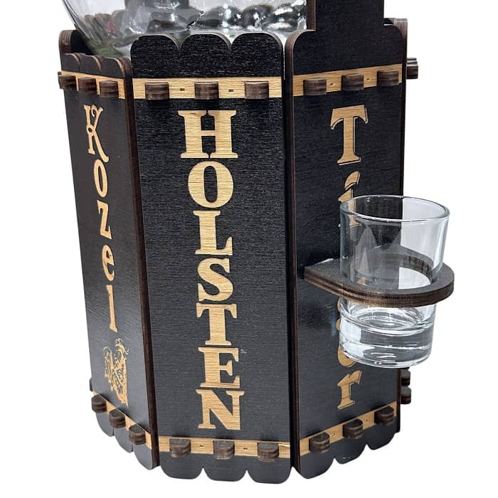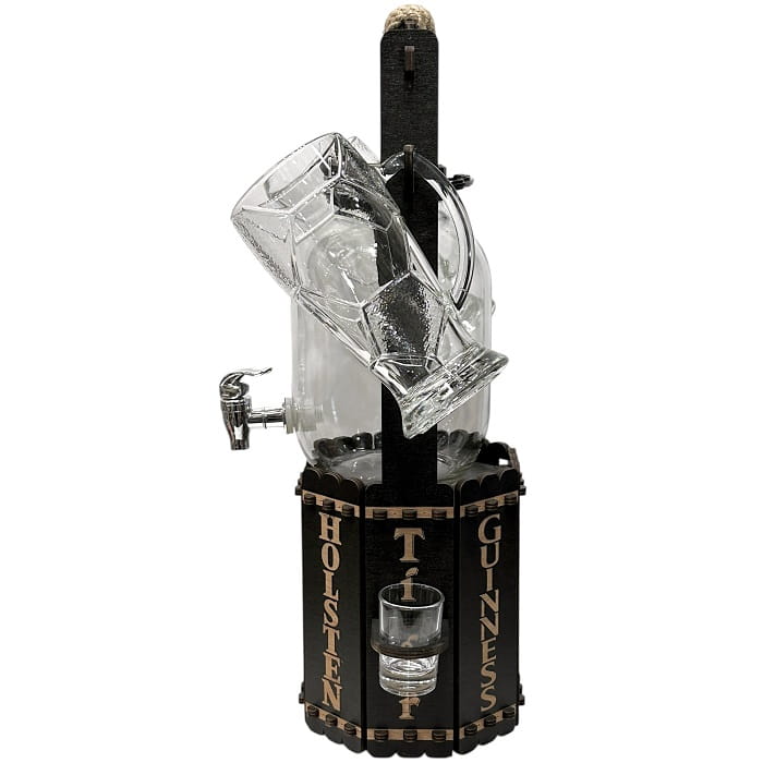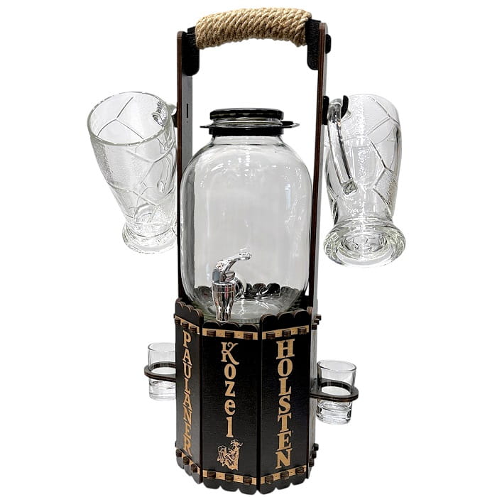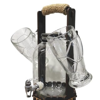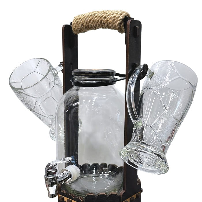 Комплект: деревянная переноска с отсеком для аксессуаров и вкусняшек, диспенсер с краном 3 литра, 2 пивных футбольных кружки по 500 мл., 2 рюмки по 40 мл..