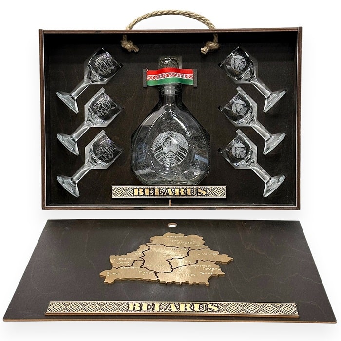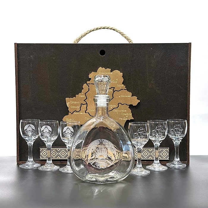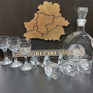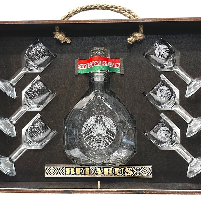 Посуда выполнена из высококачественного стекла, искусно украшены гравировкой. На рюмках с гордостью изображена символика Республики Беларусь, на штофе гравировка герба Республики Беларусь – символа гордости и независимости. Эти детали придают набору неповторимый национальный колорит и делают его ценным памятным сувениром.