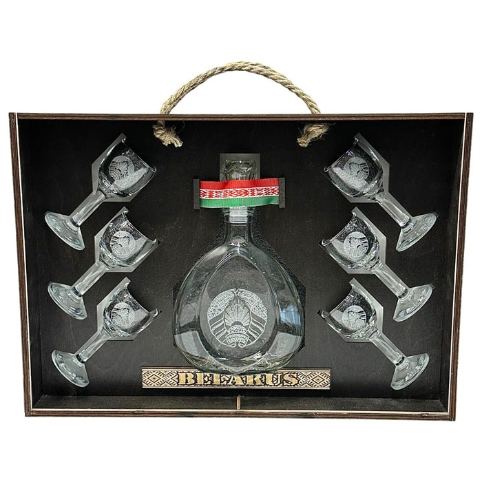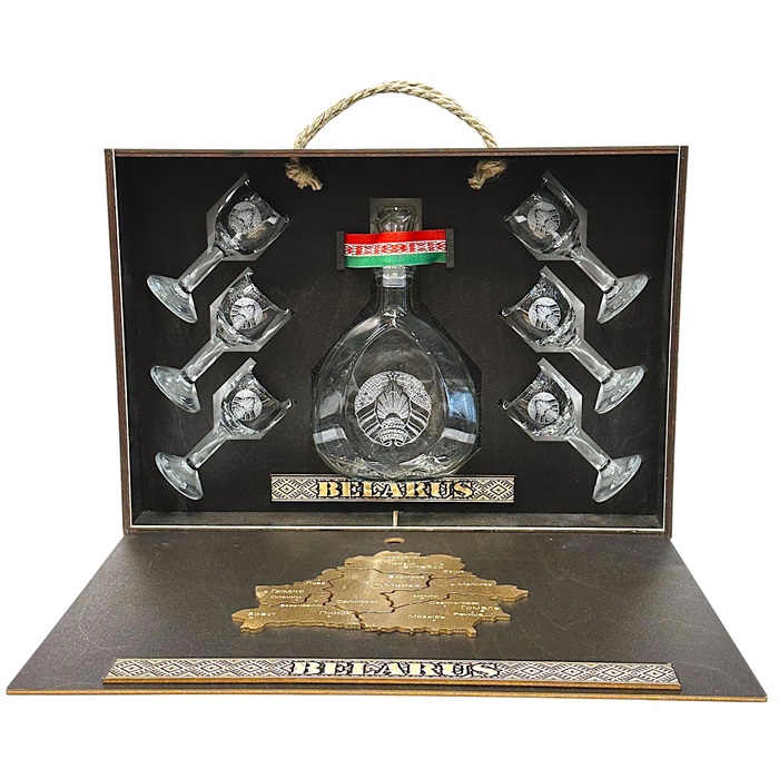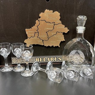 Посуда выполнена из высококачественного стекла, искусно украшены гравировкой. На рюмках с гордостью изображена символика Республики Беларусь, на штофе гравировка герба Республики Беларусь – символа гордости и независимости. Эти детали придают набору неповторимый национальный колорит и делают его ценным памятным сувениром.