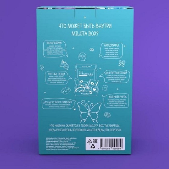 Сюрприз бокс MilotaBox «Butterfly» 8 предметов - наполнен необычными вещицами, которыми будет приятно пользоваться в повседневной жизни: милая канцелярия, уютные товары для дома, стильные аксессуары, предметы для здорового образа жизни и приятные мелочи. Внутри Milota BOX находится до 8 сюрпризов, упакованных в стилизованную подарочную бумагу тишью. Коробочка из плотного, дизайнерского картона.