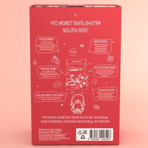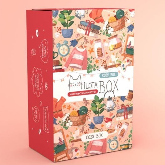 Сюрприз бокс MilotaBox «Cozy» 8 предметов - наполнен необычными вещицами, которыми будет приятно пользоваться в повседневной жизни: милая канцелярия, уютные товары для дома, стильные аксессуары, предметы для здорового образа жизни и приятные мелочи. Внутри Milota BOX находится до 8 сюрпризов, упакованных в стилизованную подарочную бумагу тишью. Коробочка из плотного, дизайнерского картона.