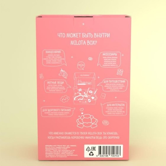 Сюрприз бокс MilotaBox «Flower» 8 предметов - наполнен необычными вещицами, которыми будет приятно пользоваться в повседневной жизни: милая канцелярия, уютные товары для дома, стильные аксессуары, предметы для здорового образа жизни и приятные мелочи. Внутри Milota BOX находится до 8 сюрпризов, упакованных в стилизованную подарочную бумагу тишью. Коробочка из плотного, дизайнерского картона.