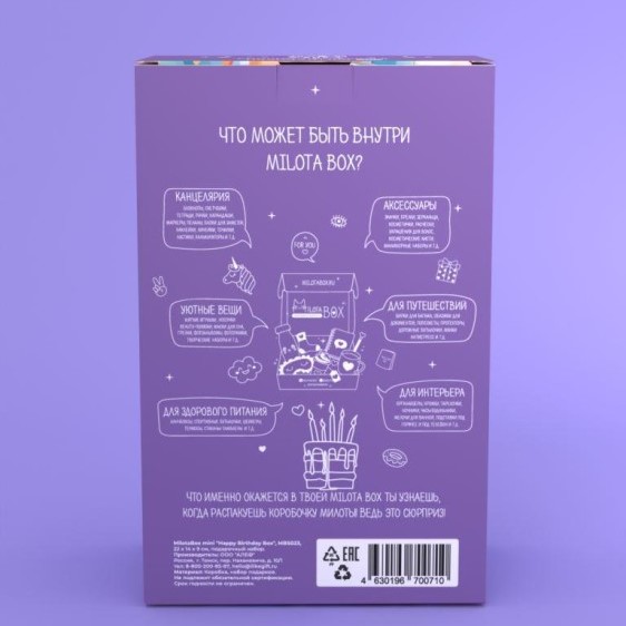 Сюрприз бокс MilotaBox «Happy Birthday» 8 предметов - наполнен необычными вещицами, которыми будет приятно пользоваться в повседневной жизни: милая канцелярия, уютные товары для дома, стильные аксессуары, предметы для здорового образа жизни и приятные мелочи. Внутри Milota BOX находится до 8 сюрпризов, упакованных в стилизованную подарочную бумагу тишью. Коробочка из плотного, дизайнерского картона.
