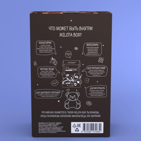 Сюрприз бокс MilotaBox «Plush» 8 предметов - наполнен необычными вещицами, которыми будет приятно пользоваться в повседневной жизни: милая канцелярия, уютные товары для дома, стильные аксессуары, предметы для здорового образа жизни и приятные мелочи. Внутри Milota BOX находится до 8 сюрпризов, упакованных в стилизованную подарочную бумагу тишью. Коробочка из плотного, дизайнерского картона.