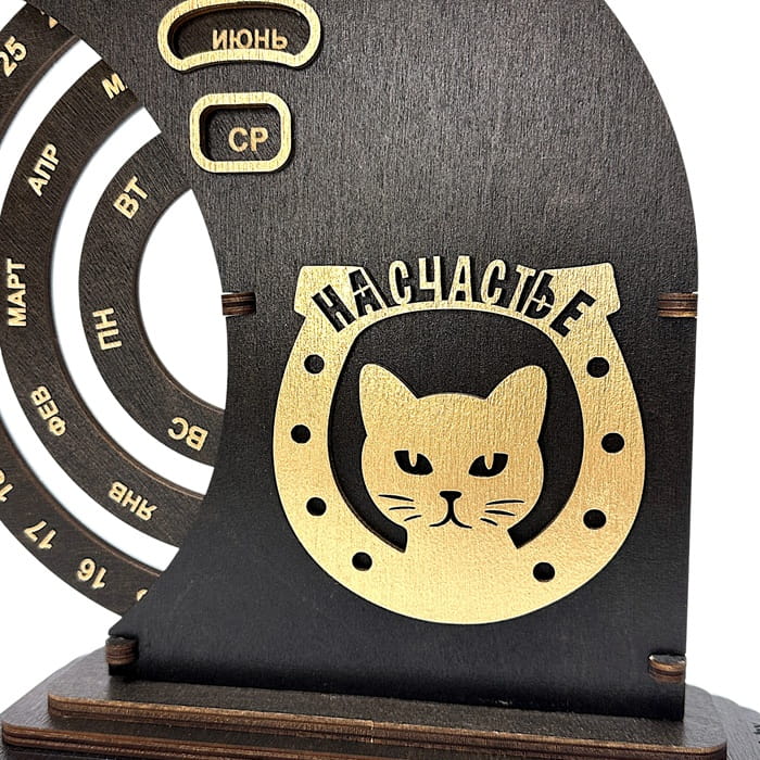Элегантный вечный календарь из дерева с изящной подковой, покрытой золотой краской, станет символом удачи и благополучия в доме. Кольца календаря нужно вращать, чтобы в окошках появлялись соответствующий месяц, день недели и число.