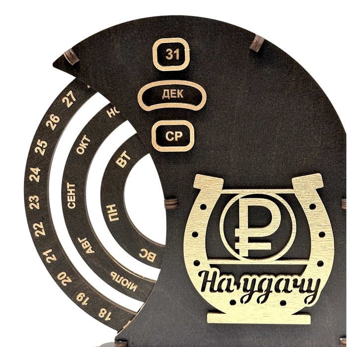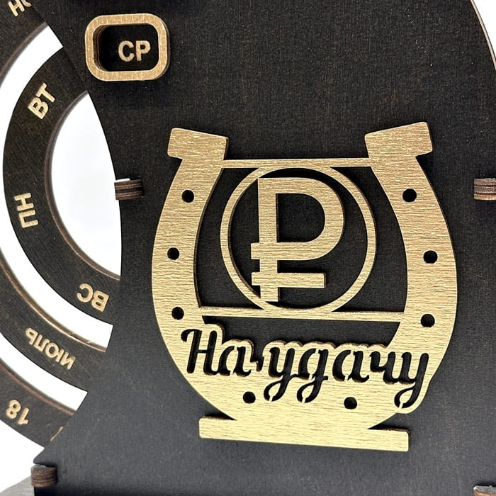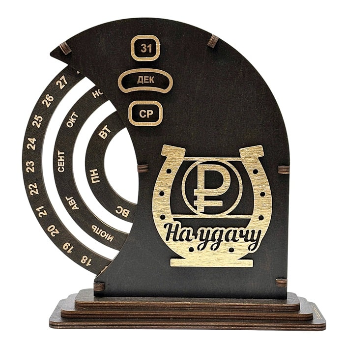 Ищете оригинальный подарок, который будет радовать долгие годы? Этот деревянный календарь с российским рублём в подкове - идеальное решение!
