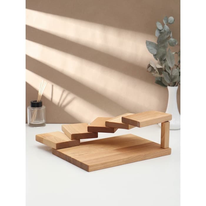 Доска для подачи блюд «Лесенка» деревянная выполнена из массива натуральной березы придает не только особый уют. Доска очень функциональна: на ней можно подавать любимые орешки и сухофрукты, поставить два бокала любимого пива, просматривать фильм на гаджете. Оборотная сторона может использоваться как разделочная доска для продуктов. Изделие станет стильным и уютным элементом вашей кухни и незаменимым аксессуаром для сервировки стола. В процессе изготовления доска обрабатывается органическим маслом повышенной очистки, что надежно защищает ее от влаги и бактерий на длительное время, а также сохраняет естественный цвет дерева.