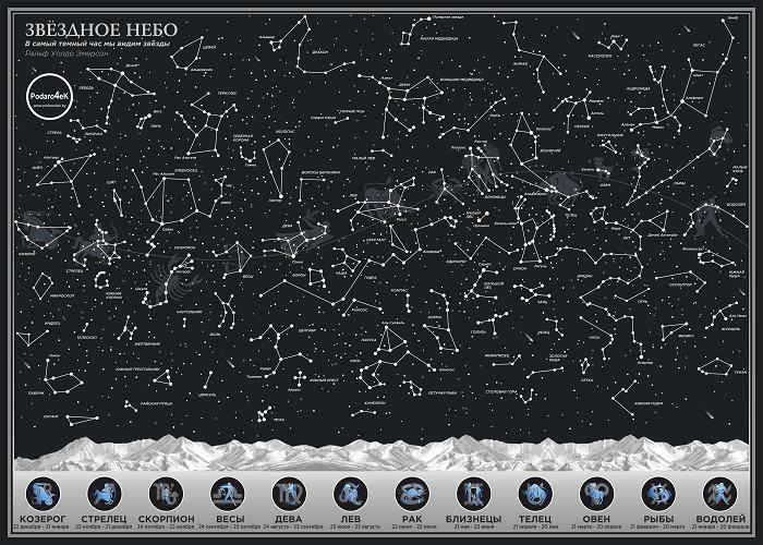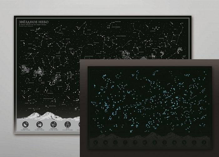 Карта звездного неба – уникальное пособие для изучения расположения звезд и небесных систем. На карте можно найти самые крупные созвездия и звезды, которые входят в знаки зодиака. Специальная флюоресцентная краска придает небесным телам натуральное свечение, которое буквально завораживает в темное время суток и создает полную иллюзию звездного неба.