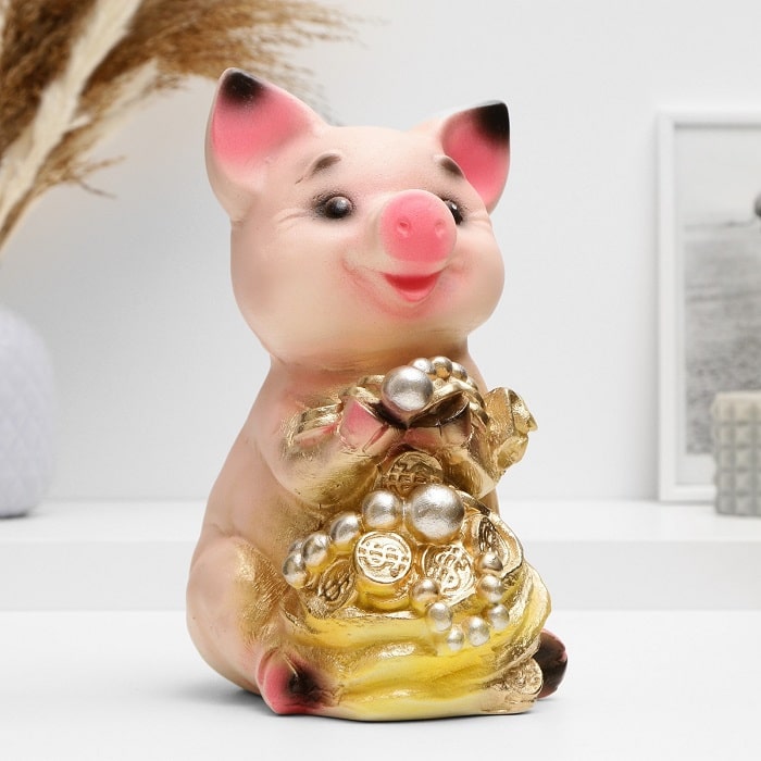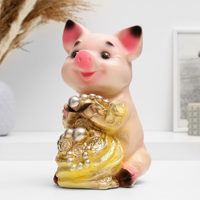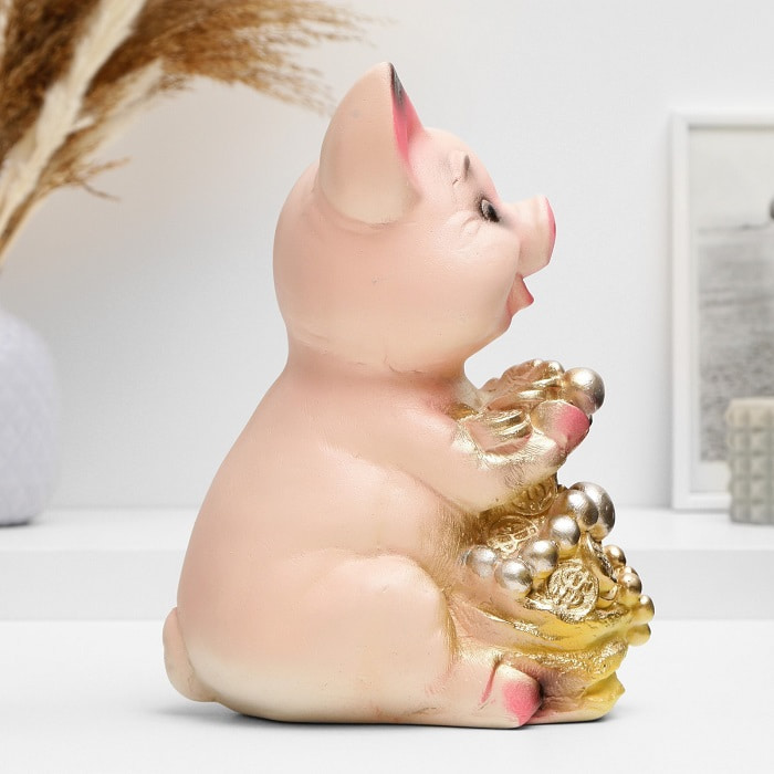 Копилка-свинка для монет «Поросенок с мешком золота» оптимальна по размеру для накопления на небольшие, но приятные «хотелки». Когда она наполнится до краёв, копилку необходимо разбить!