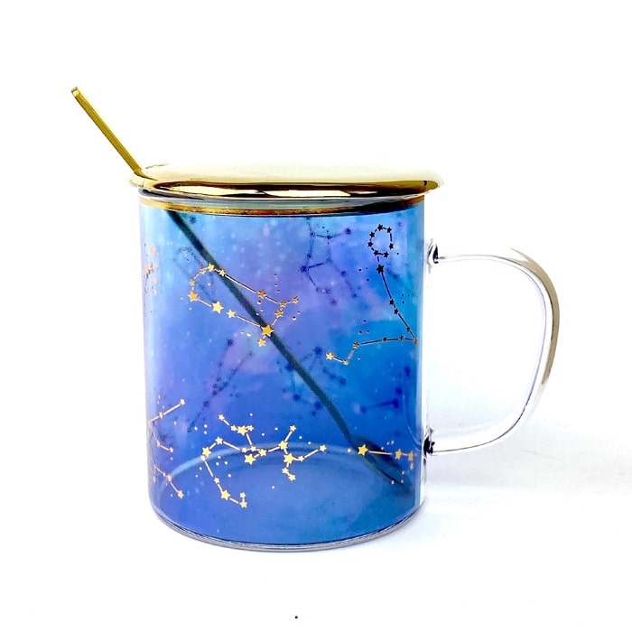 Кружка с изображением созвездий снабжена керамической крышкой и ложкой. Полупрозрачное стекло и тонкая каллиграфия оттеняют изящество рисунка.