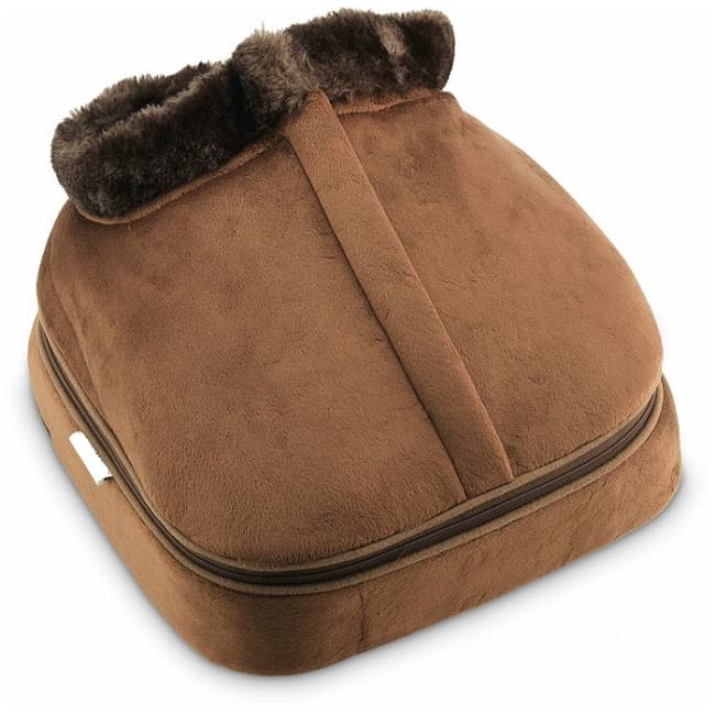 К основанию на молнии пристегивается верхняя часть: текстильный верх с плюшевым покрытием, превращающий устройство в большой тапочек на две ноги сразу. Опции те же: переключатель сбоку запускает режим грелки (нет шанса простудам!) или вибрации (блаженство массажа ног). Можно просто греть ноги в тапке, не включая его, например, пока вы сидите за компьютером: даже без дополнительного нагрева плюш теплый и непродуваемый.
