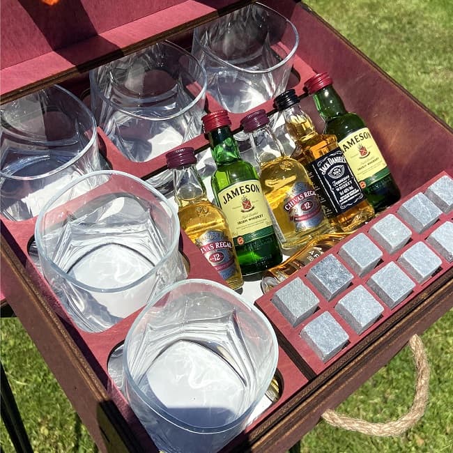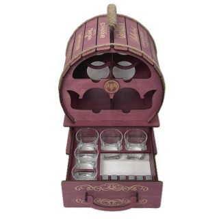 В наборе: стакан для виски* 5 шт., камни для виски 12 шт. которые хранятся в специальном выдвижном ящике под бочкой. Полка имеет декоративную ручку. Так что здесь все под рукой. Необычный дизайн мини-бар позволит ему вписаться в обыденный и необычный интерьер дома.