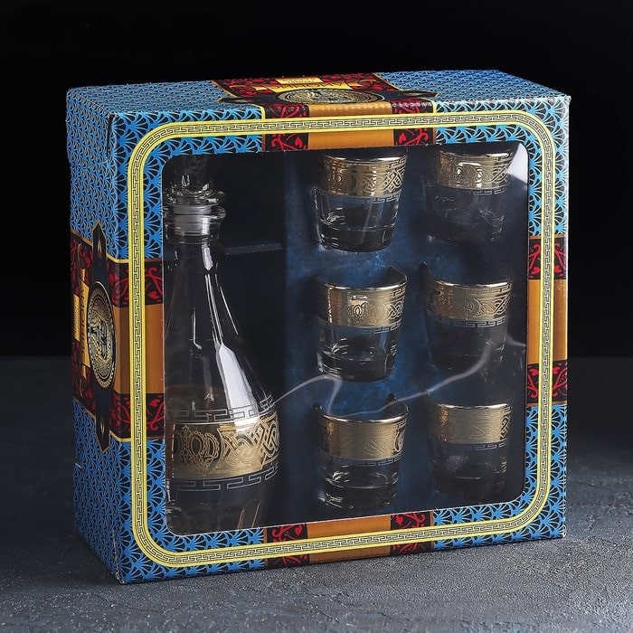 Комплектация: графин, 6 рюмок, подарочная коробка.