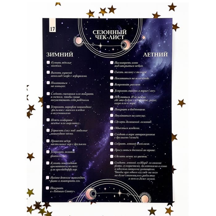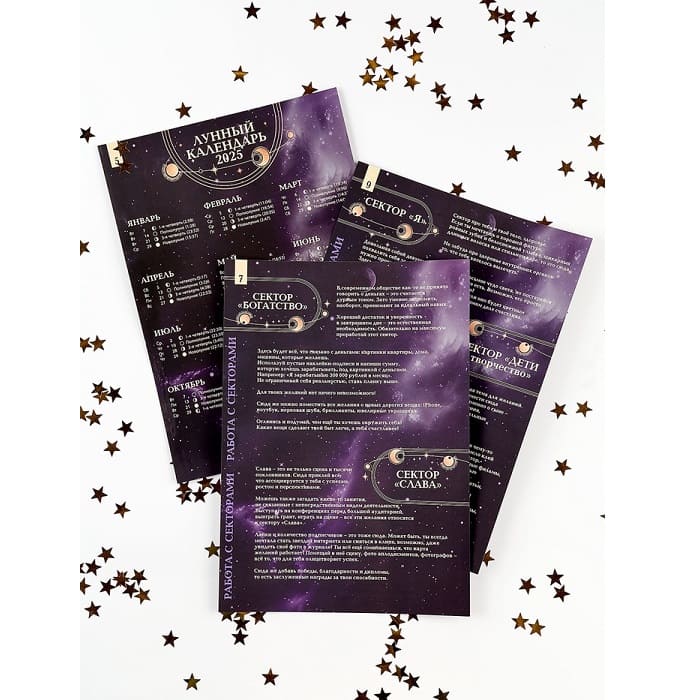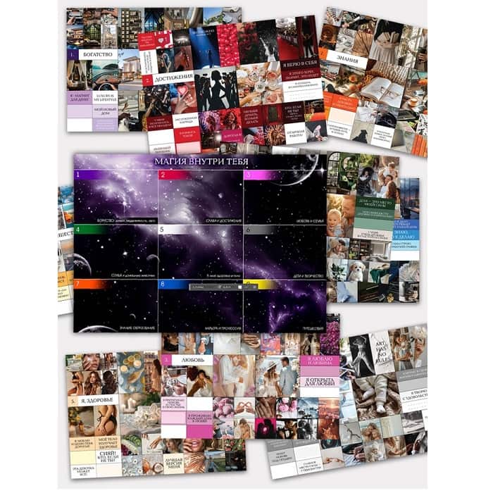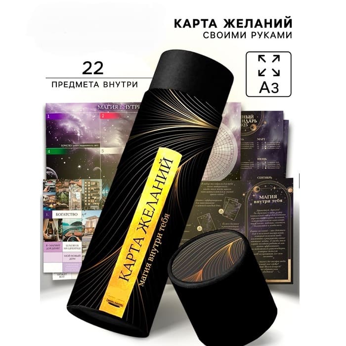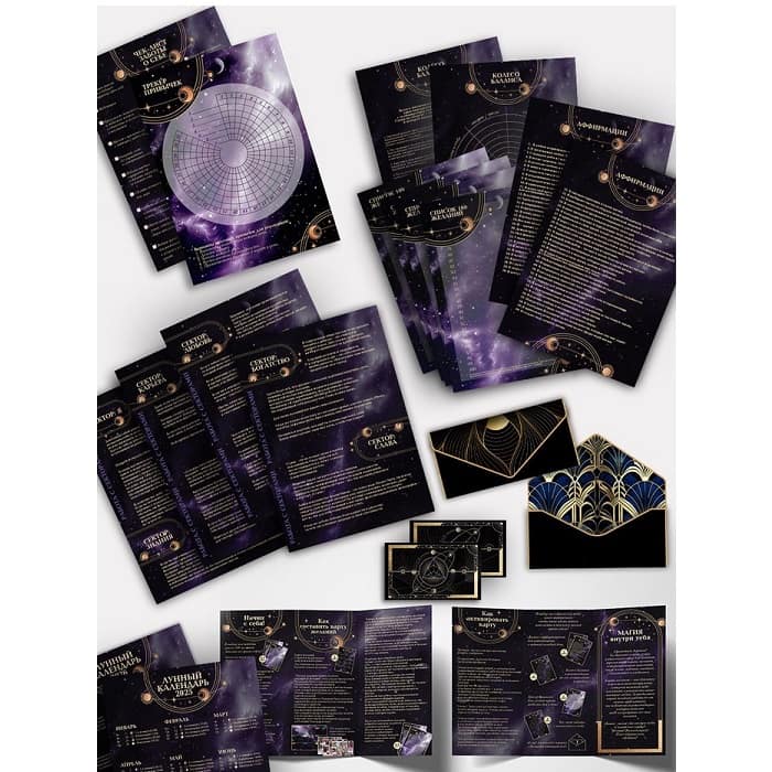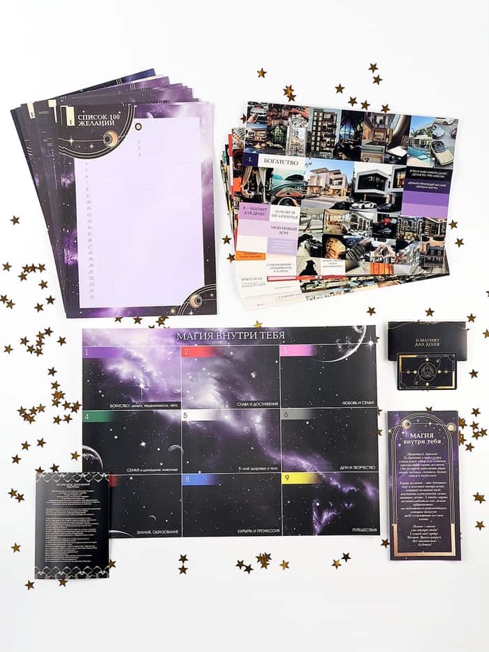 Комплектация: карта желаний Багуа А3, листы с наклейками по секторам, трекер привычек, чек-лист заботы о себе, листы с аффирмациями, колесо баланса, списки желаний, лунный календарь, магическая карта-талисман, подробные инструкции.