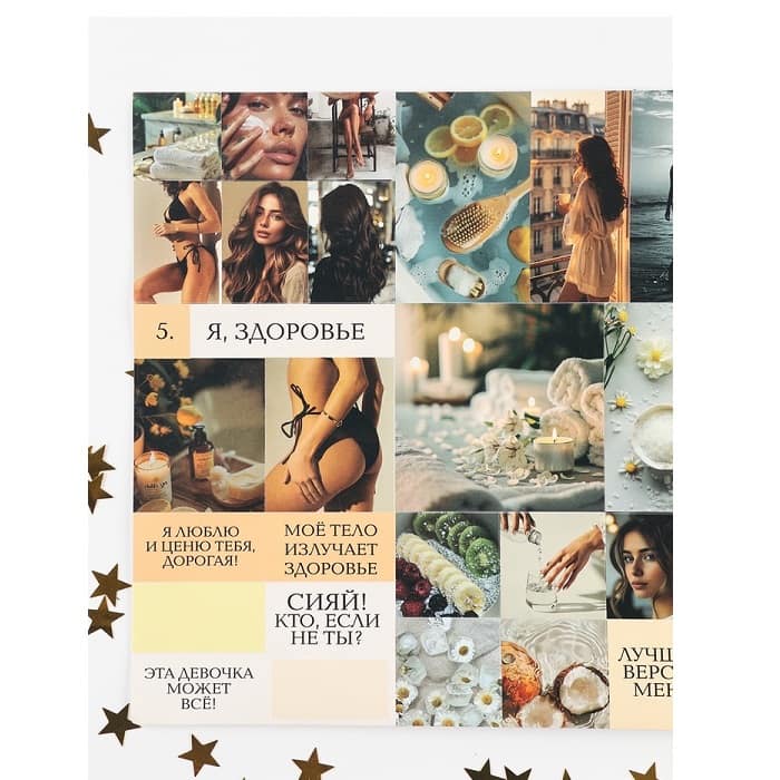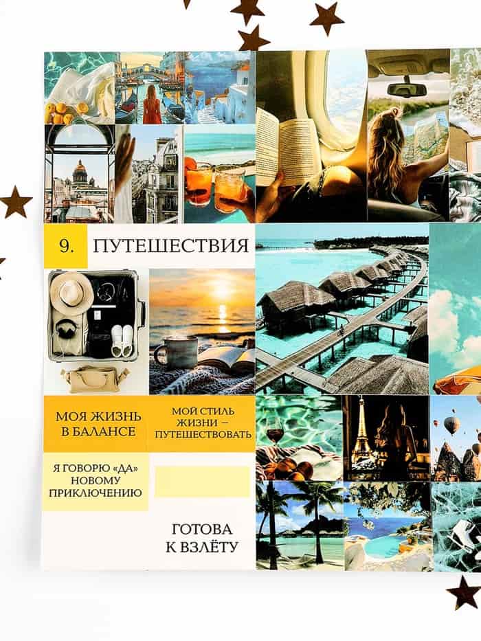 Карта желаний: поговорив честно с самим собой, точно решив, что хочешь больше всего на свете в разных сферах - фиксируй это на нашей карте желаний. И приклеивай соответствующую картинку, там самым визуализируй свои мысли.