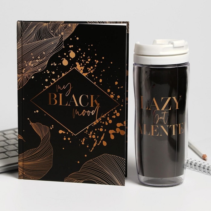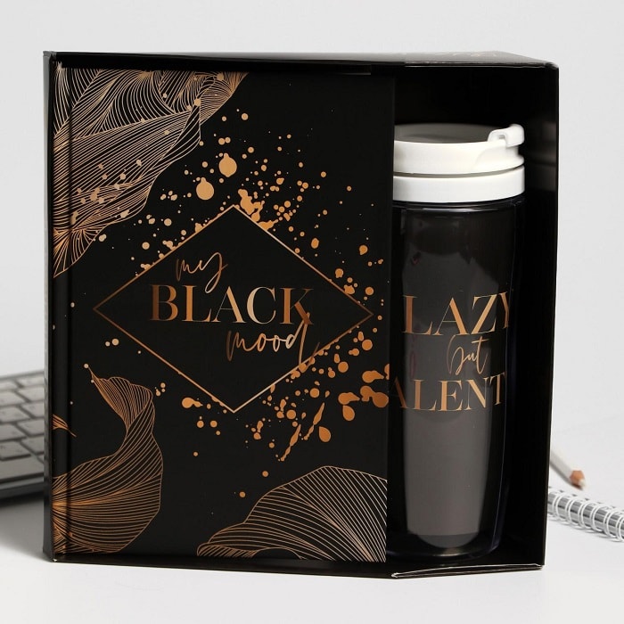 Набор: ежедневник + термостакан «Black mood» - это яркий и полезный подарок! Выполненные в одном стиле блокнот для записей и термостакан займут достойное место на рабочем столе. Термостакан вмещает в себя 350 мл. напитка и поддерживает температуре до 3-х часов. В ежедневнике 80 листов, где можно делать важные заметки. Набор упакован в подарочную коробку- это уже готовый сувенир.