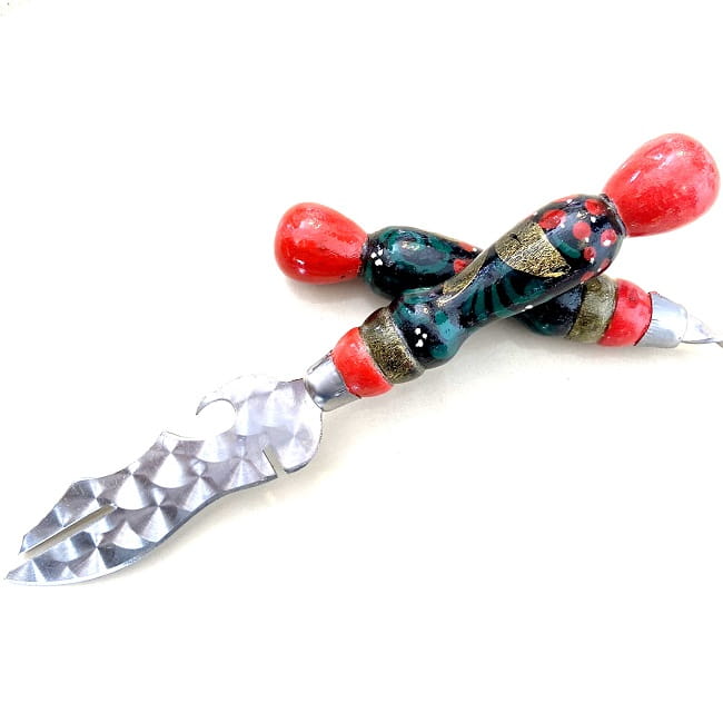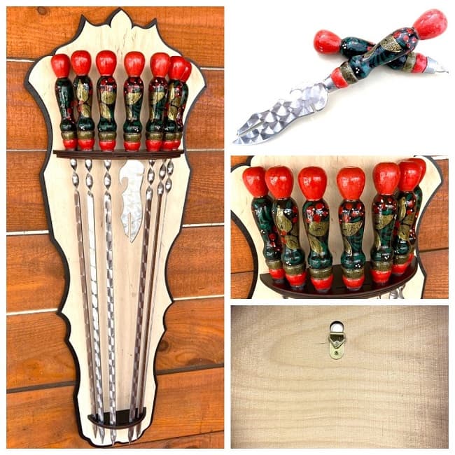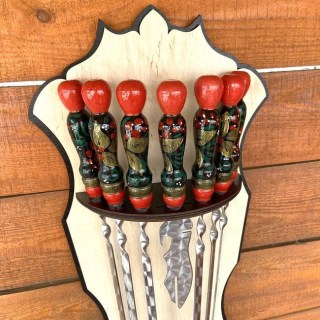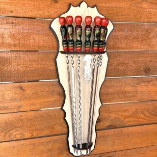 Отлично подойдет для украшения зоны барбекю и в качестве подарка! В комплекте 6 шампуров с деревянной ручкой и вилка-нож для снятия мяса.