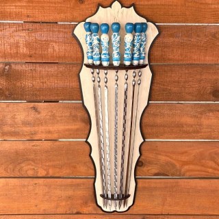 Отлично подойдет для украшения зоны барбекю и в качестве подарка! В комплекте 7 шампуров с деревянной ручкой и деревянный щит на подвесе.