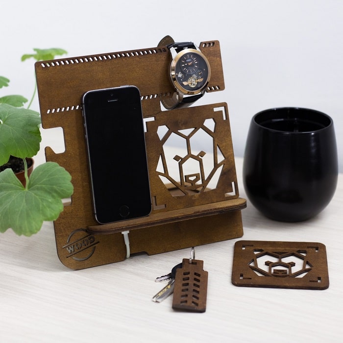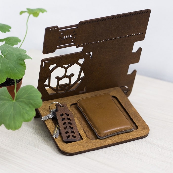 Органайзер станет украшением рабочего стола или прикроватной тумбочки и поможет навести на них порядок. Изделие имеет разъём для провода, позволяет хранить телефон, часы, запонки, серьги, ключи, мелкие аксессуары, банковские карты, визитки. Кроме того, одна из деталей может служить подставкой под горячее, в комплекте деревянный брелок для ключей.