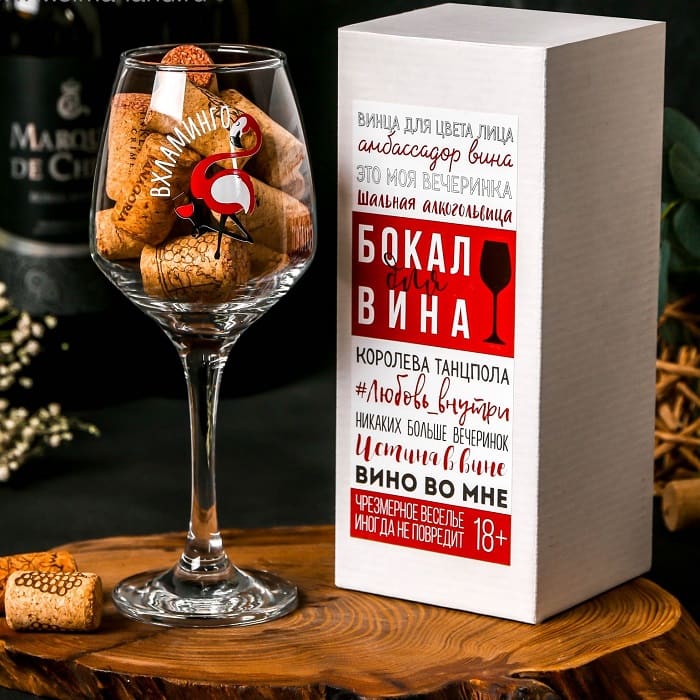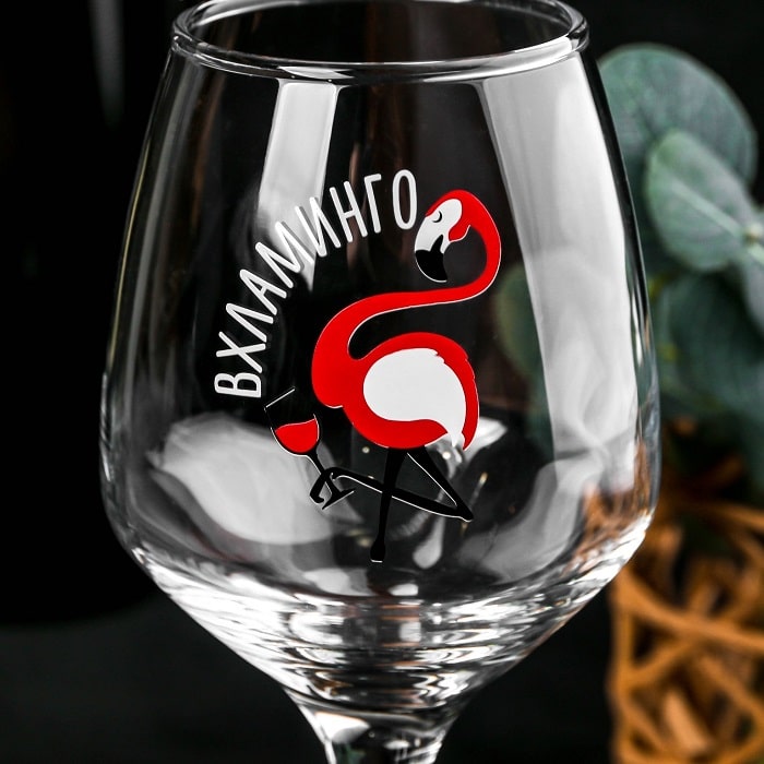 Бокал для вина «Вхламинго» 350 мл.- отличный подарок для любителей вина . Яркая и веселая надпись будет радовать свою владелицу и поднимать настроение окружающим.