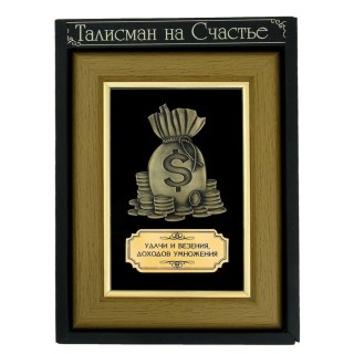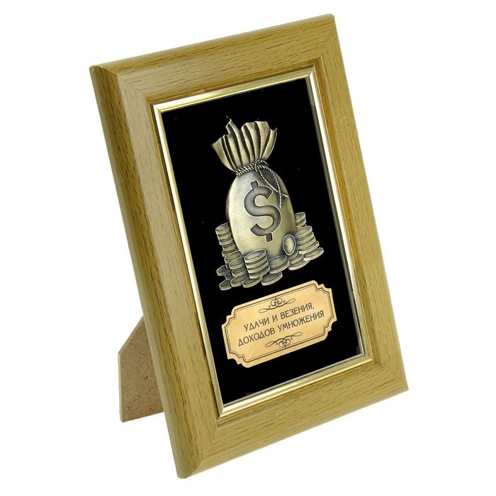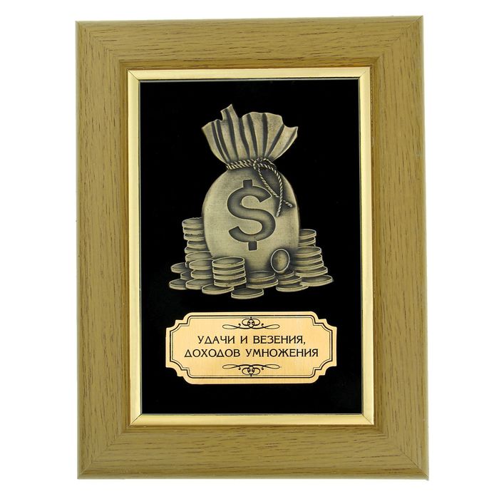 Оригинальное панно состоит из изоброжения мешка с деньгами, изготовленного из металла, золотой наклейки с теплым пожеланием и деревянной рамки. Вся композиция упаковывается в картонную коробку и прозрачный чехол.