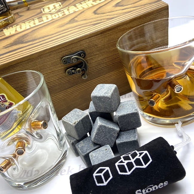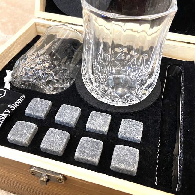 Набор для виски– оригинальный комплект для распития спиртных напитков на две персоны, включающий стаканы, камни для виски, щипцы для льда/камней, подставки под стаканы 2шт, мешочек для хранения камней.
