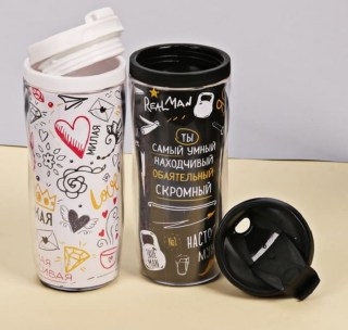 Термостакан — это отличный вариант подарка человеку, который постоянно находится в движении. Залейте любимый напиток в термостакан, и она сохранит его исходную температуру( до 3 - х часов). Кружка подходит для использования в автомобиле, на природе или дома. Парные термостаканы- это отличный подарок на праздник всех влюбленных. Такой сувенир можно преподнести романтической или супружеской паре.