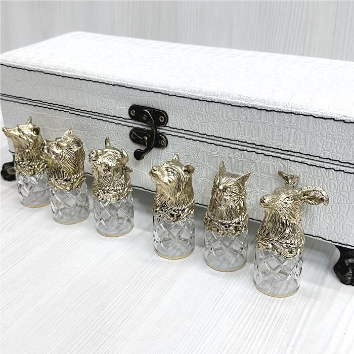 Каждая рюмка изготовлена из хрусталя и сплава металла на оловянной основе. Фигурки животных отражают художественное мастерство. Рельефные детали голов выполнены с безукоризненной точностью и аккуратностью. Дизайн рюмок продуман таким образом, чтобы они сохраняли устойчивое положение и в перевернутом положении. Набор рюмок-перевертышей упакованы в изящную подарочную коробку.