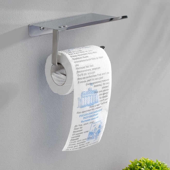 Качественная двухслойная туалетная бумага , где в прикольной форме написано первая часть бытовой лексики разговорника. Туалетная бумага-прикол «Русско-английский разговорник» – оригинальный сувенир для людей, ценящих чувство юмора.